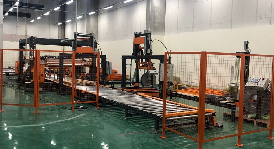 為配合這個(gè)具有劃時(shí)代意義的項(xiàng)目,滿足其生產(chǎn)效率,小黃蜂以旗艦產(chǎn)品T1300高速立式智能纏繞機(jī)領(lǐng)銜,攜手麥斯泰克MK300全自動(dòng)穿劍打包機(jī),并配有覆頂膜機(jī)和紙護(hù)角機(jī),共同完成夏普項(xiàng)目的后段自動(dòng)化包裝流水線!